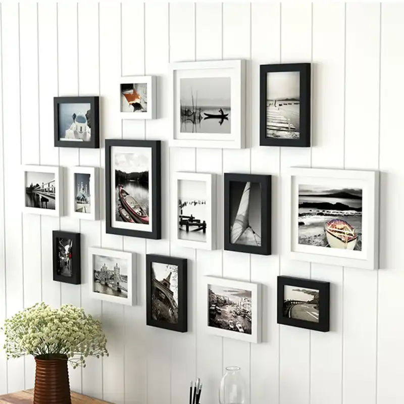 If your living room has no space for the wall, place picture frames on floating shelves. This set of picture frames will help you create a collage of your favourite family photos. Creating a gallery wall is a perfect idea for any kind of space: Family picture frame ideas and ornament for displaying your home portraits.